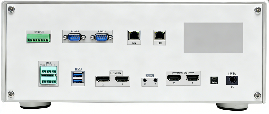 • 音频矩阵:支持2路HDMI内嵌音频、1路3.5mm LINE IN线路输入(连接麦克风或医疗设备音频)、1路UAC数字音频输入;输出方面同样提供2路HDMI内嵌、1路3.5mm LINE OUT及UAC输出,构建完整音视频回路。