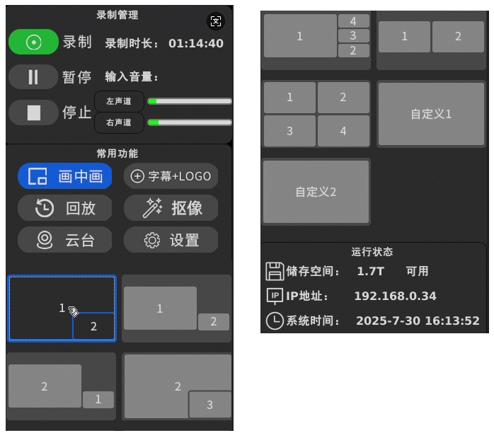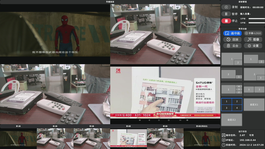 • 导播画面:支持单画面、多画面、画中画等多种导播模式。提供7个固定画面布局模板和2个自定义画面布局,满足快速切换与个性化制作需求。